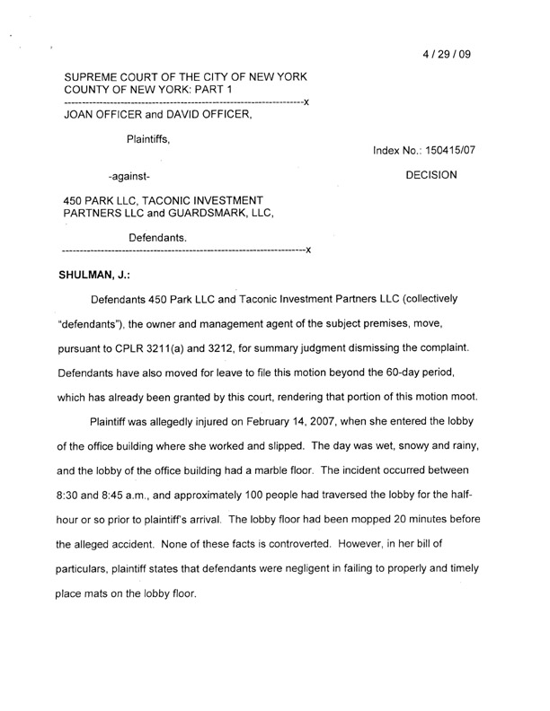JOAN OFFICER and DAVID OFFICER -against- 450 PARK LLC. TACONIC INVESTMENT PARTNERS LLC and GUARDSMARK, LLC.