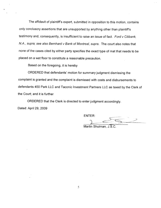 The Supreme Court, New York County, by The Honorable Martin Schulman, JSC, granted our motion for CPLR 3212 summary judgment dismissing the complaint. (relied on Dr. Abraham's Affidavit)